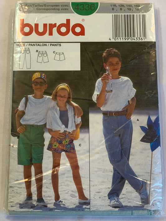 Burda Sewing Pattern 4336 Girls'/Boys' Pants, Shorts, Pockets, Zipper Front, 3 Lengths, Size 6-12, Uncut, 2000