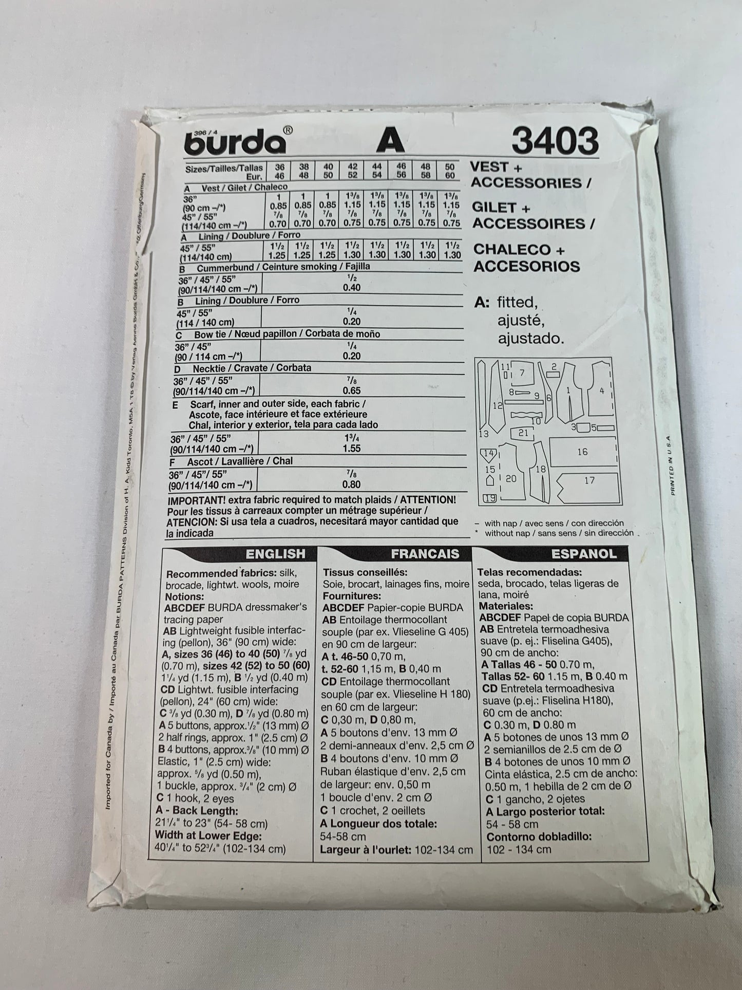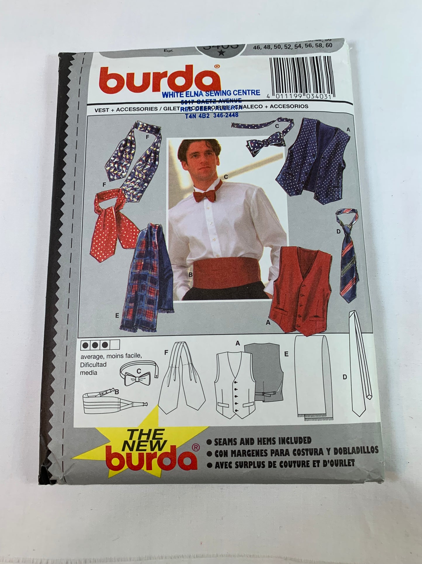 Burda Sewing Pattern 3403 Mens' Vest, Accessories, Necktie, Scarf, Bow Tie, Cummerbund, Ascot, Size 36-50, Cut, 2006