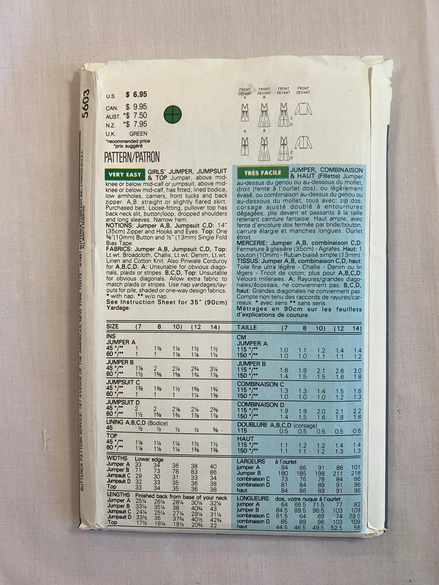 Butterick Busybodies Sewing Pattern 5603 Girls' Jumper, Jumpsuit, Top, Two Lengths, Loose-Fitting, Sleeveless, Zipper Back, Dropped Shoulders, Flared, Size 7-10, Uncut, Vintage 1991