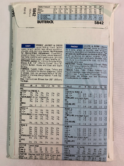 Notions: Jacket: 1/2" Shoulder pads. Dress A,B: 14" Zipper, One 7/8" Button. Hooks and eyes and Seam Binding.