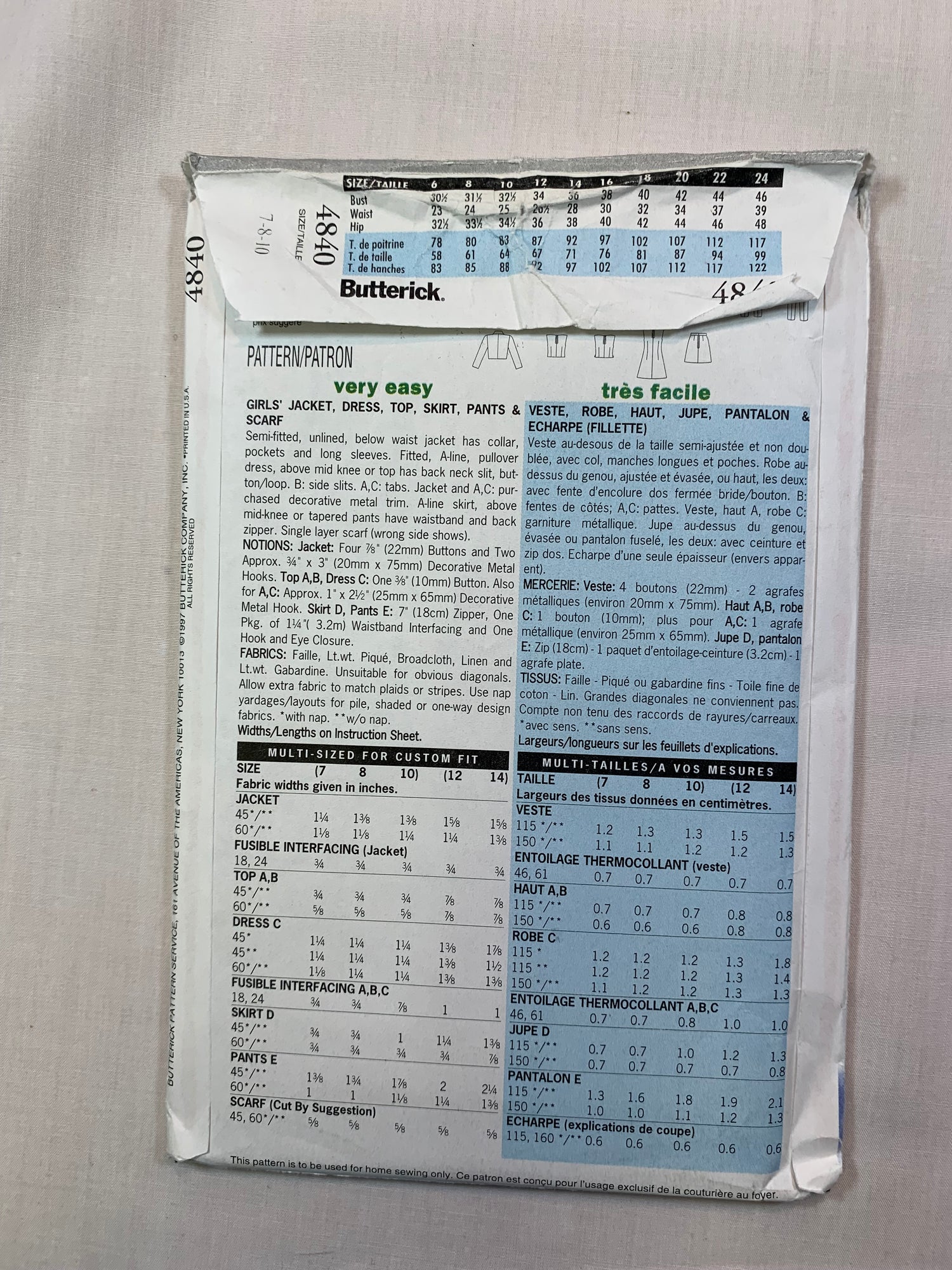 Butterick 4840 Girls' Jacket, Dress, Top, Skirt, Pants, Scarf, Size 7-10, Uncut, Vintage 1997