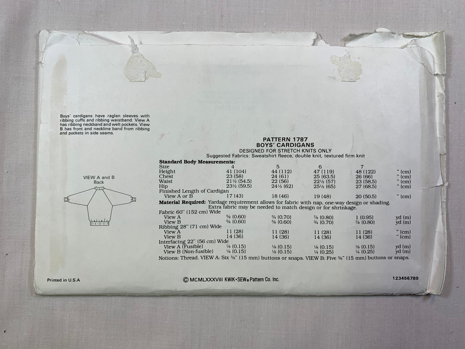 KWIK 1787 Boys' Cardigans. Size 4-7, Uncut, Vintage 1988