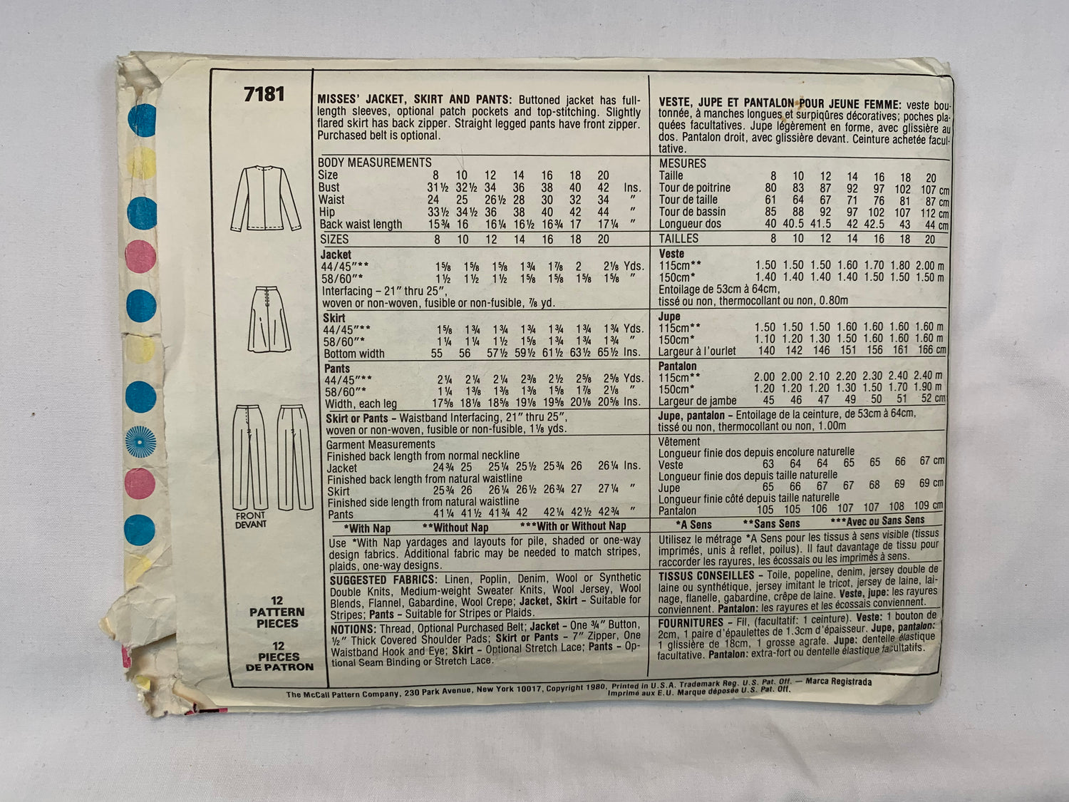 McCall's 7181 Misses' Jacket, Pants, Skirt, Size 12, Cut, Vintage 1980