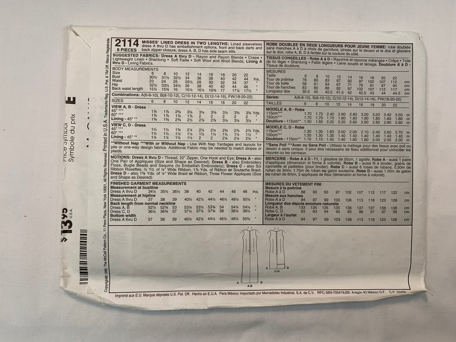 McCall's 2114 Misses' Lined Dress, Size 8-12, Uncut, Vintage 1999