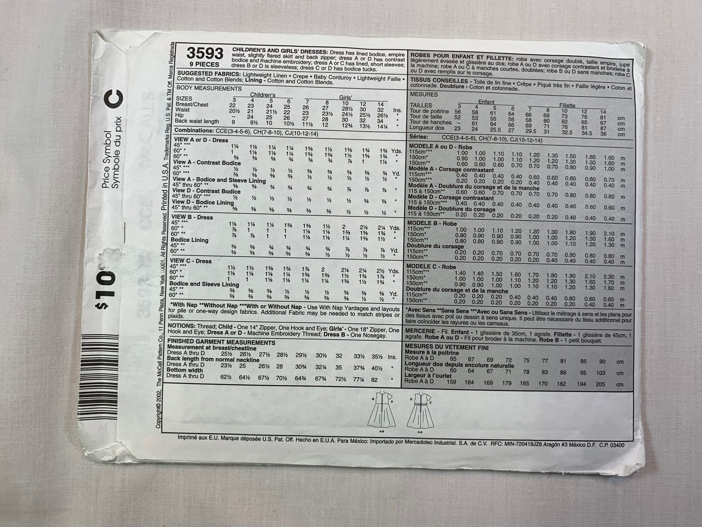 McCall's 3593 Children's Girls' Dresses, Size 3-6, Uncut, 2002