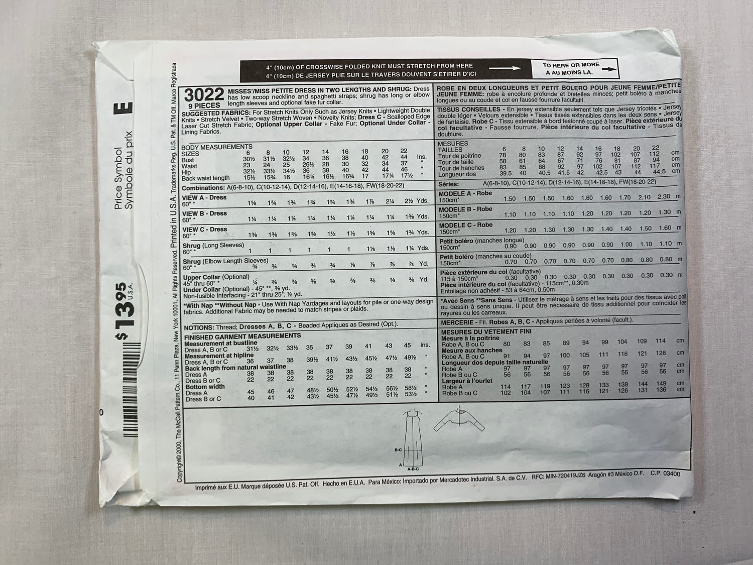 McCall's 3022 Misses'/Miss Petite Dress. Shrug, Size 10-14, Uncut, 2000