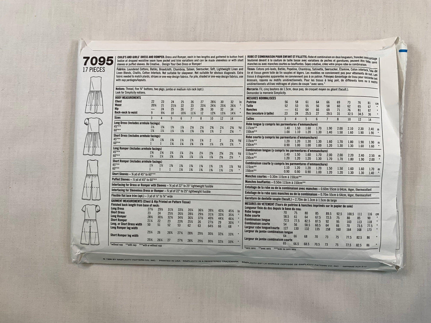 Simplicity 7095 Girls' Dress, Romper, Size 7-12, Uncut, Vintage 1996