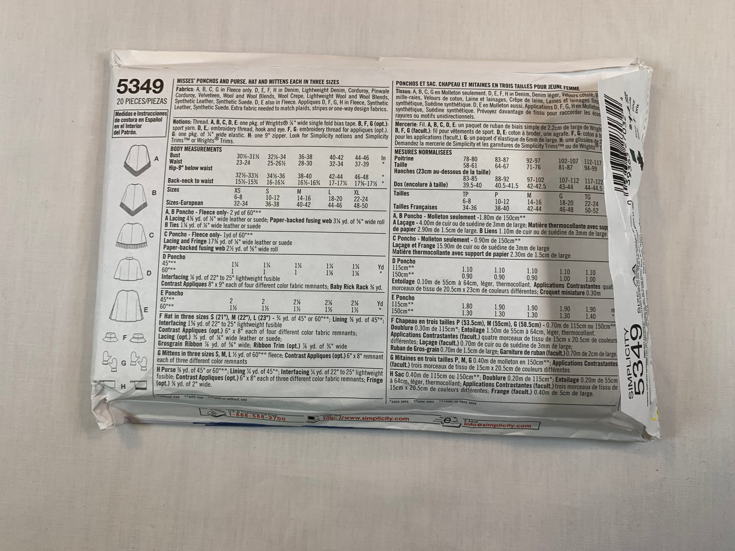 Simplicity 5349 Misses' Ponchos, Purse, Hat Mittens, Size 6-16, Uncut, 2003