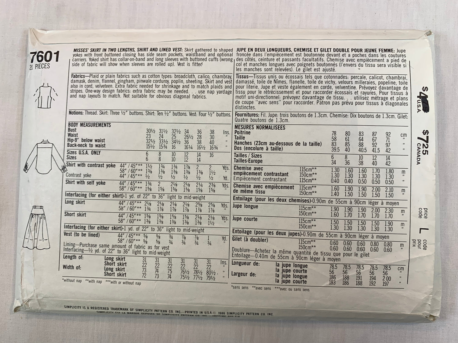 Simplicity 7601 Misses' Shirt, Vest, Skirt, Size 12, Cut, Vintage 1986
