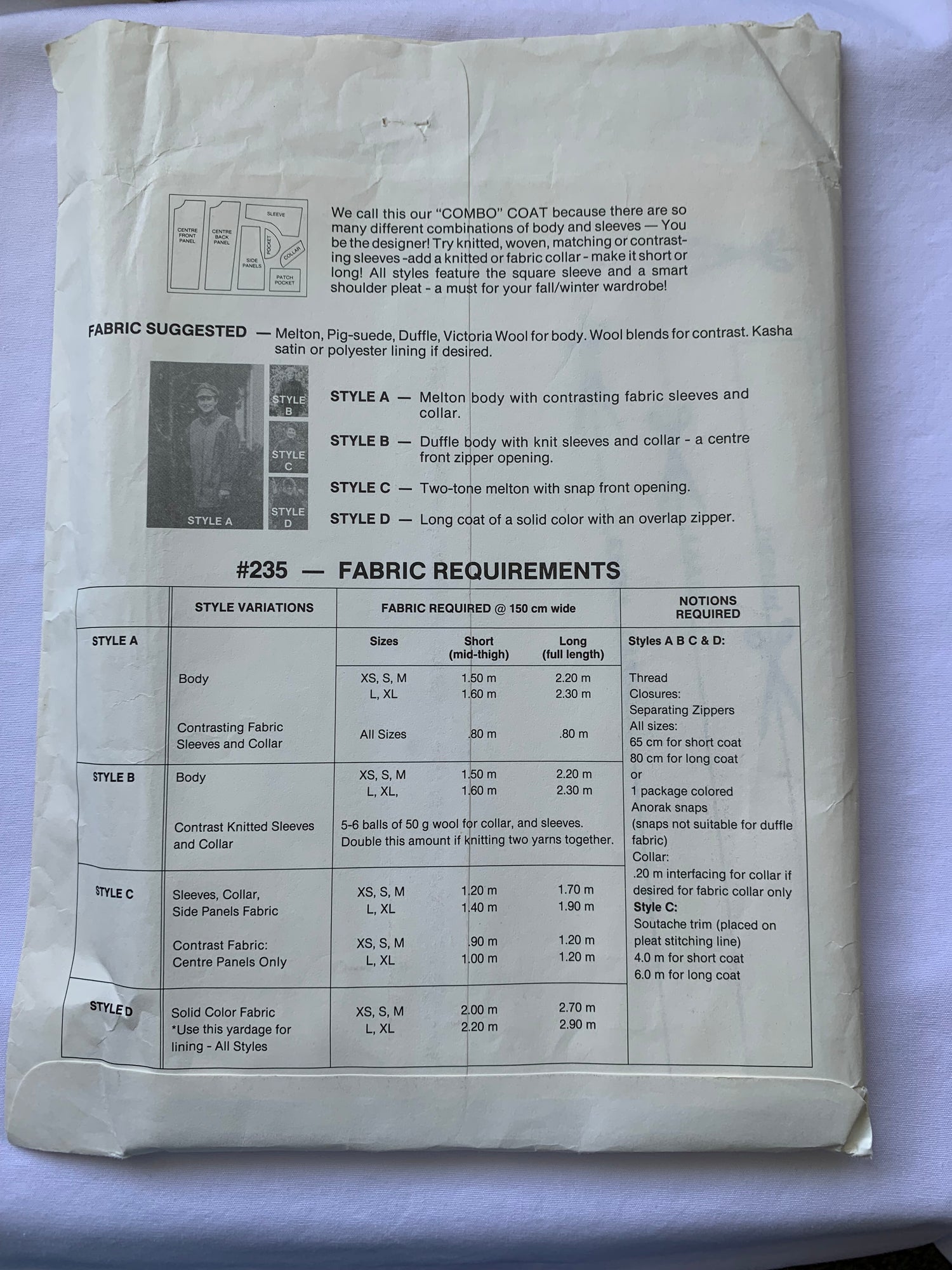 Unique Sewing Patterns 235 Adult Combo Coat MacPhee Workshop,4 Variations, Collar, Button Front, Size XS-XL, Uncut, Vintage 1980 1991