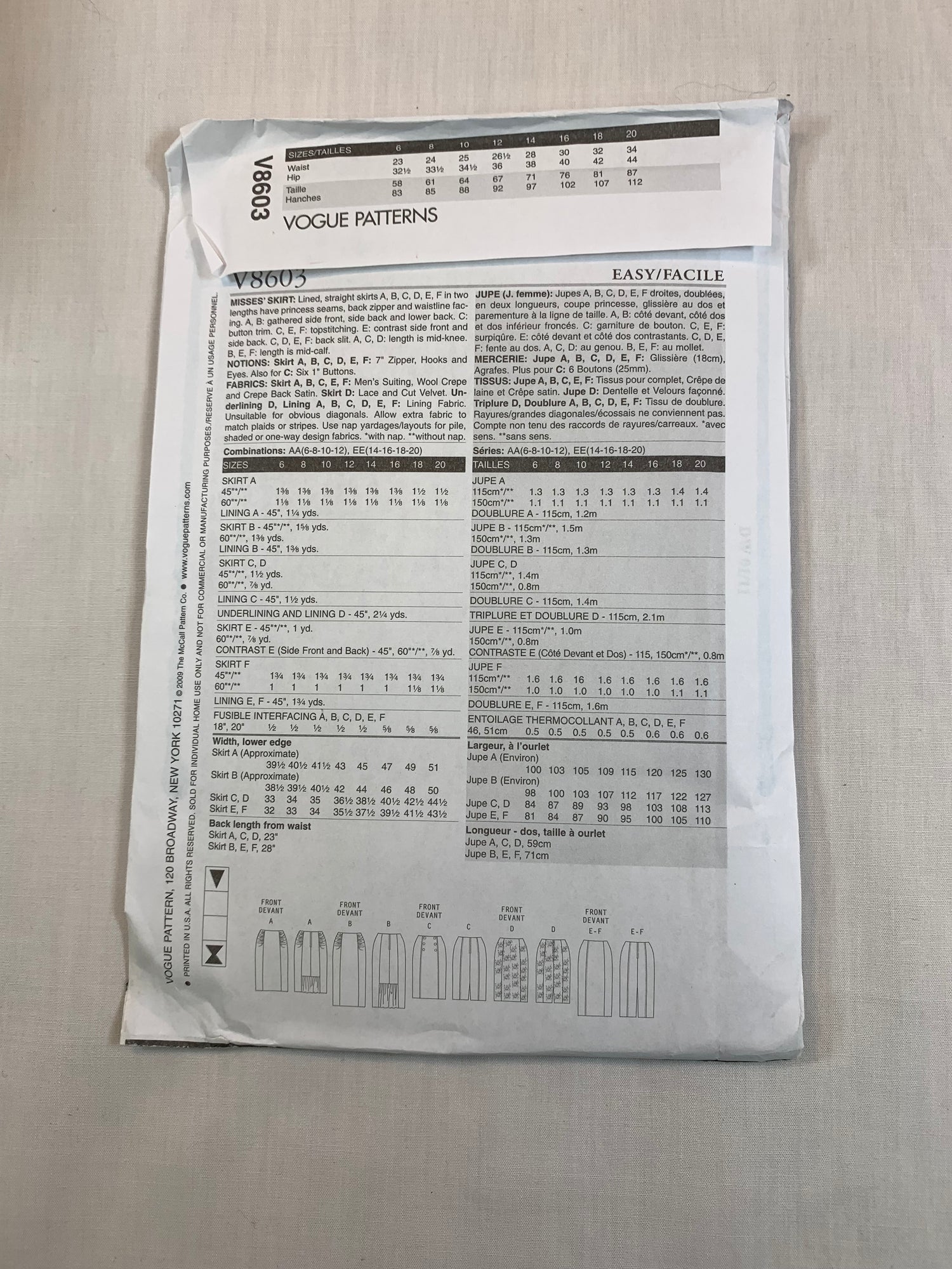Vogue V8603 Misses' Skirts, Size 6-12, Uncut, 2009