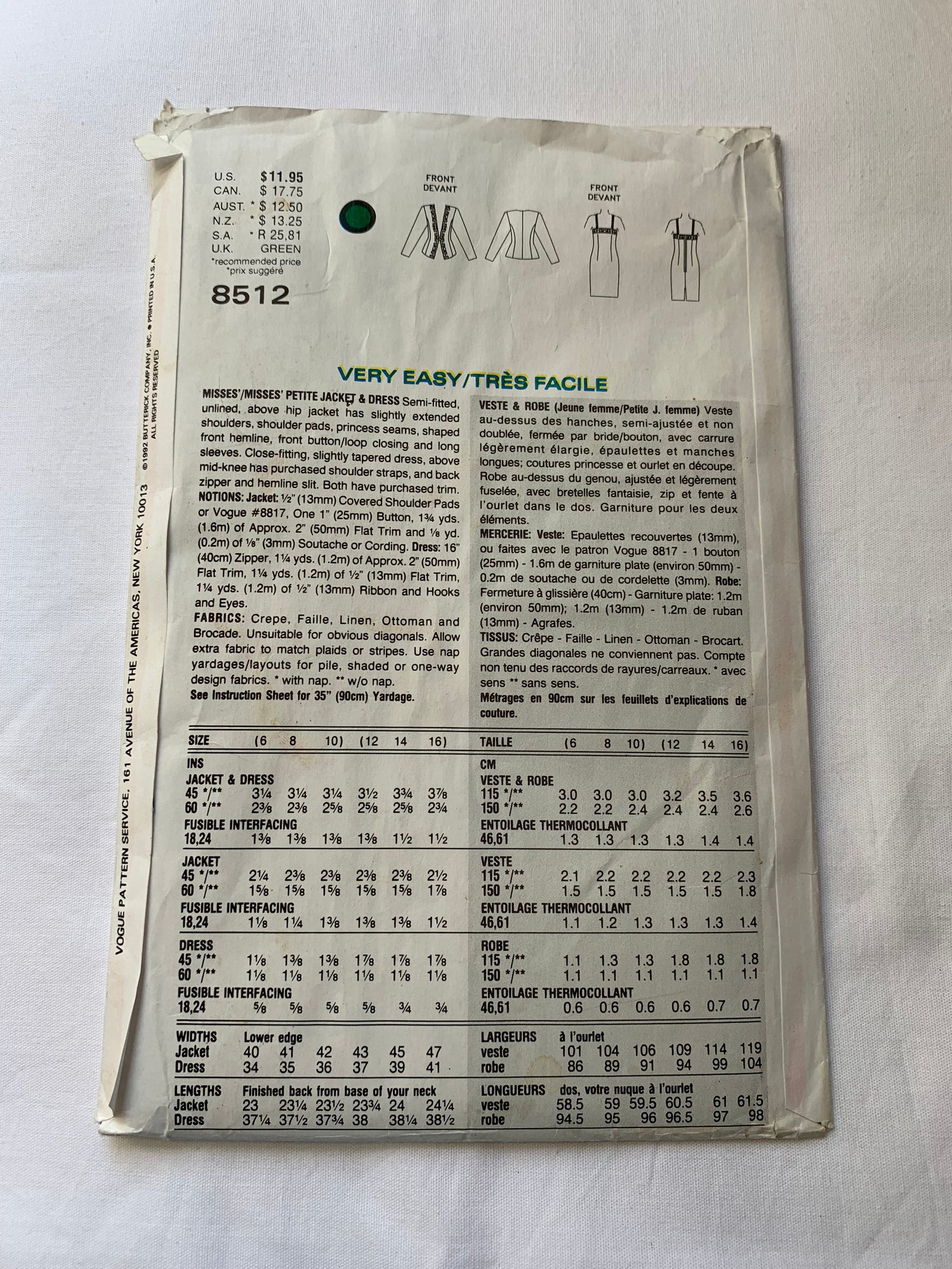Vogue Sewing Pattern 8512 Misses'/Misses' Petite Jacket, Dress, Sleeveless, Long Sleeves, Shoulder Straps, Close-Fitting, Size 12-16, Cut, Vintage 1993