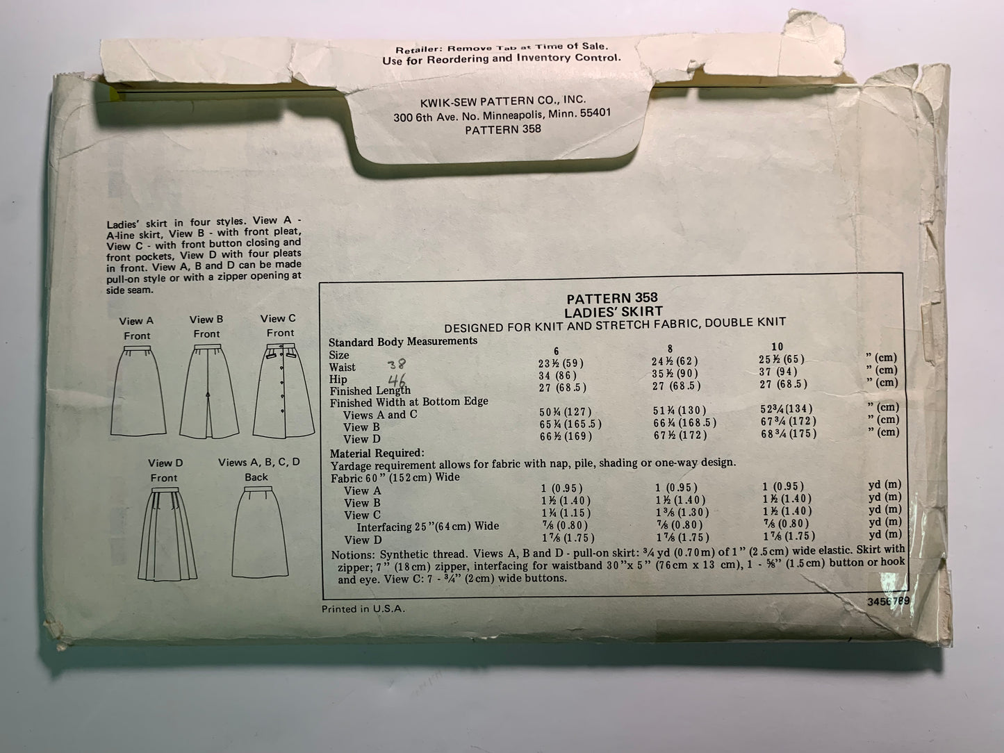 KWIK 358 Misses' Skirt, Size 6-10, Cut