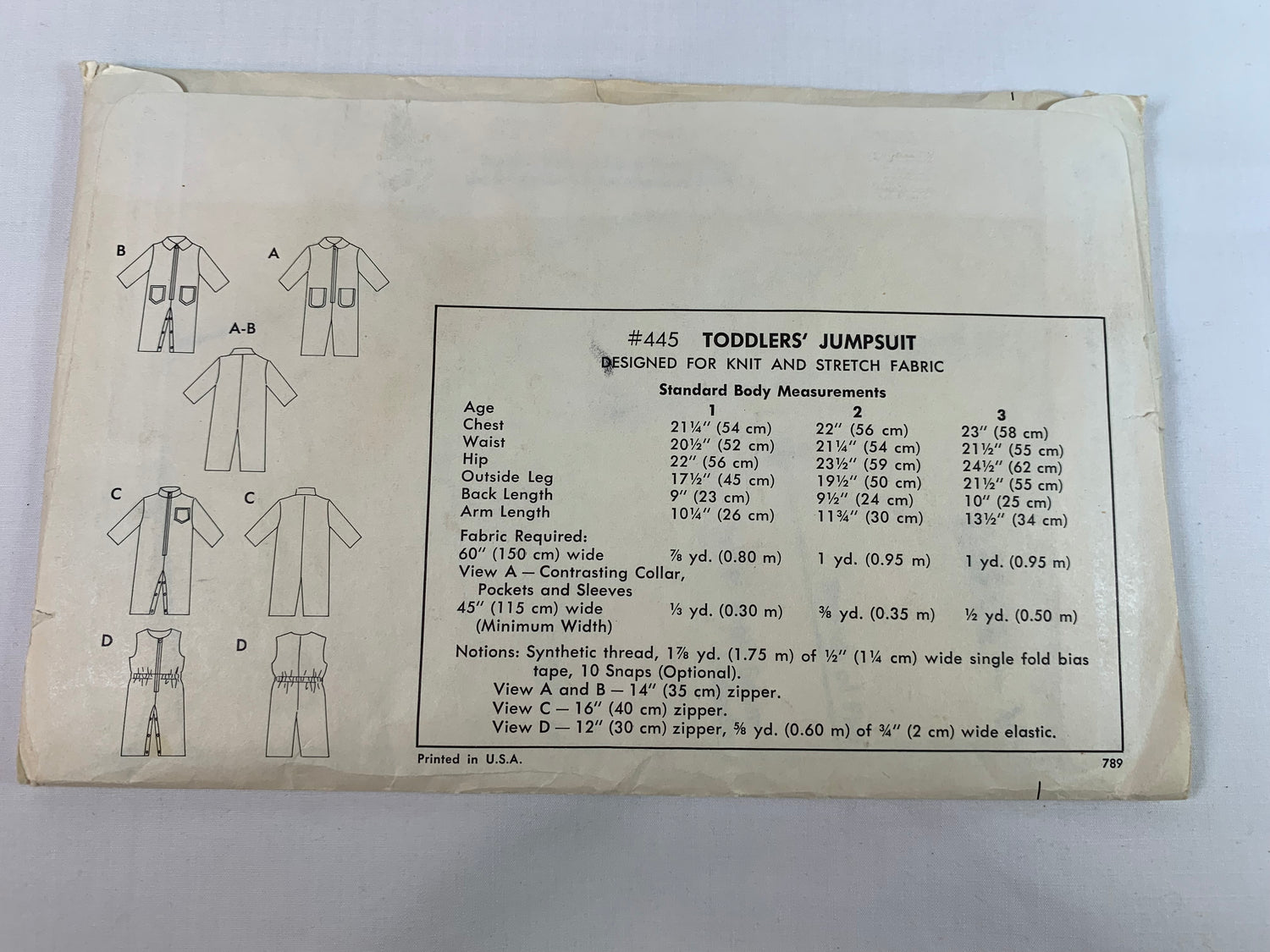 Notions: Synthetic thread, 1 7/8 yd. of 1/2" wide single fold bia tape, 10 Snaps. View A and B: 14" zipper, View C: 16" Zipper. View D: 12" zipper, 5/8 yd. of 3/4" wide elastic.