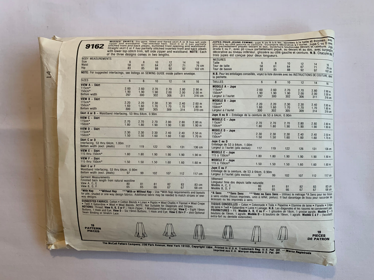 McCall's Sewing Pattern 9162 Misses' Skirt, Button Front, Side Zipper, Two Lengths, Fitted, Pleats, Waistband, 6 Variations, Cut, Size 14, Vintage 1984