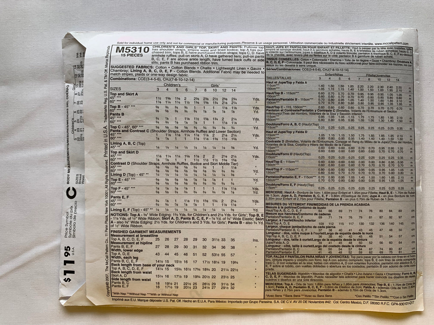 McCall's Sewing Pattern M5310 Children's/Girls' Top, Skirt, Pants, Sleeveless, Pull-On, Elastic Waist, Two Lengths, Size 3-5, Cut, 2007