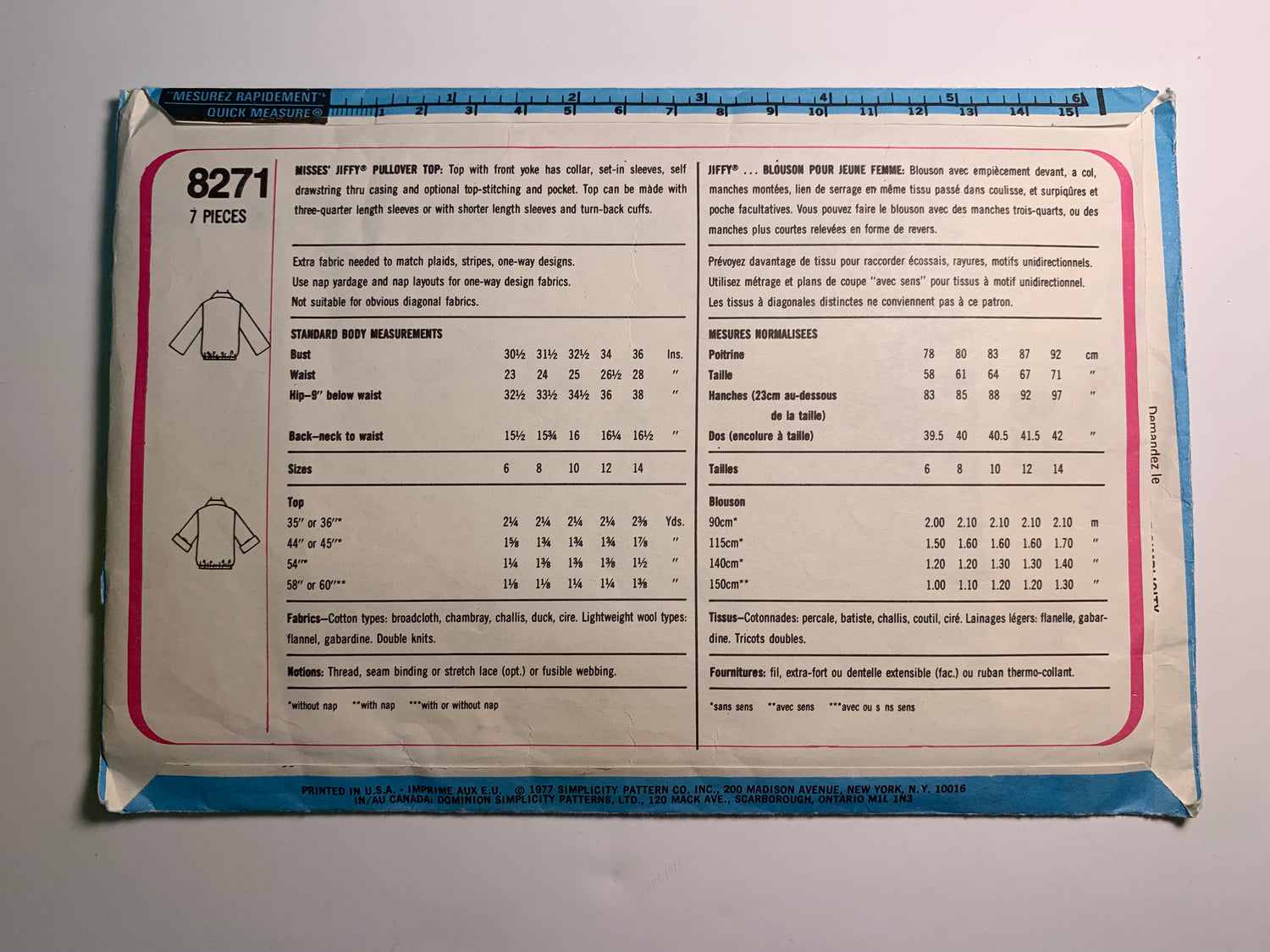 Simplicity 8271 Misses' Pullover Top, Size 10, Cut, Vintage 1977