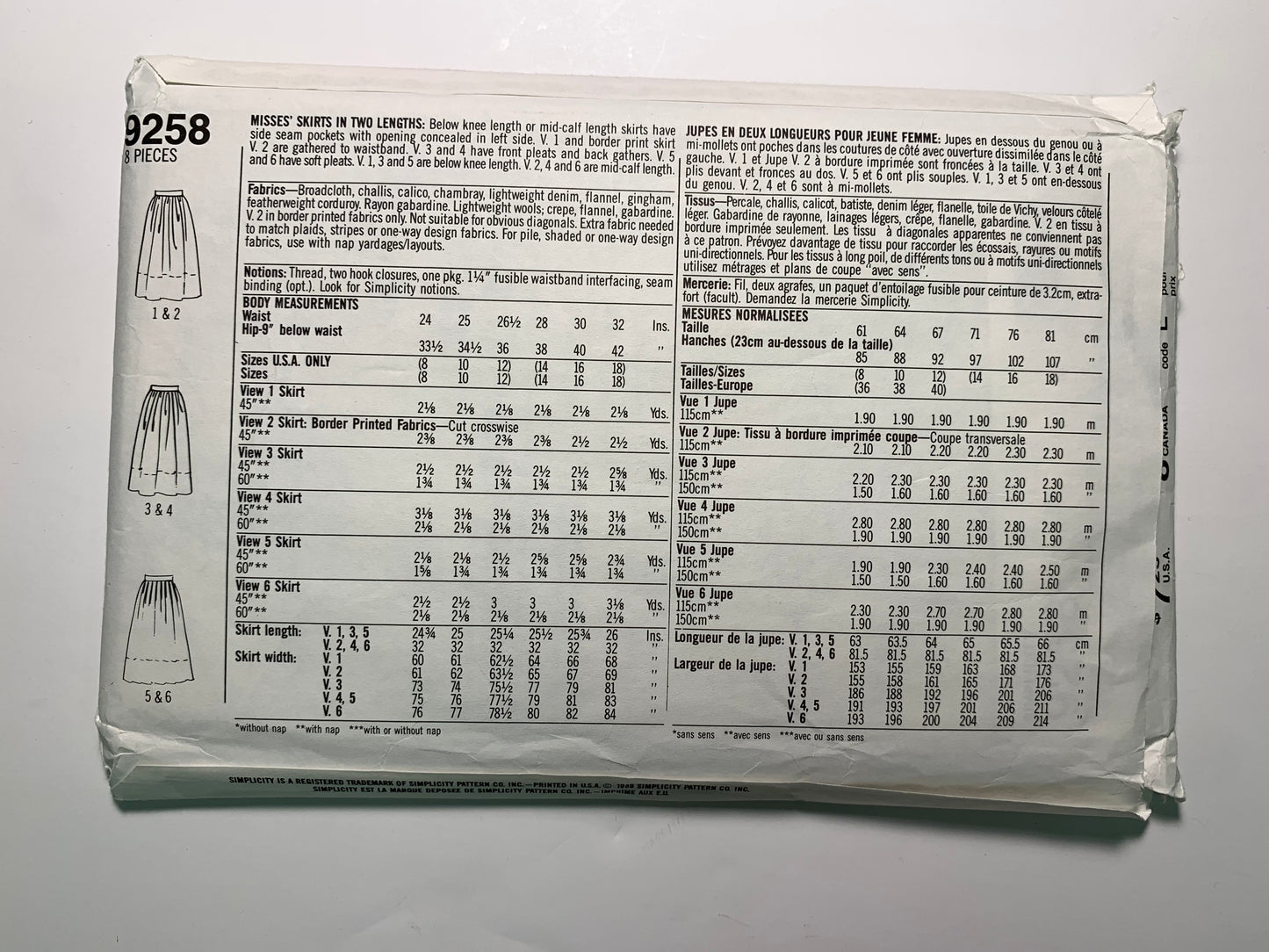 Simplicity 9258 Misses' Skirts, Size 8-12, Uncut, Vintage 1989