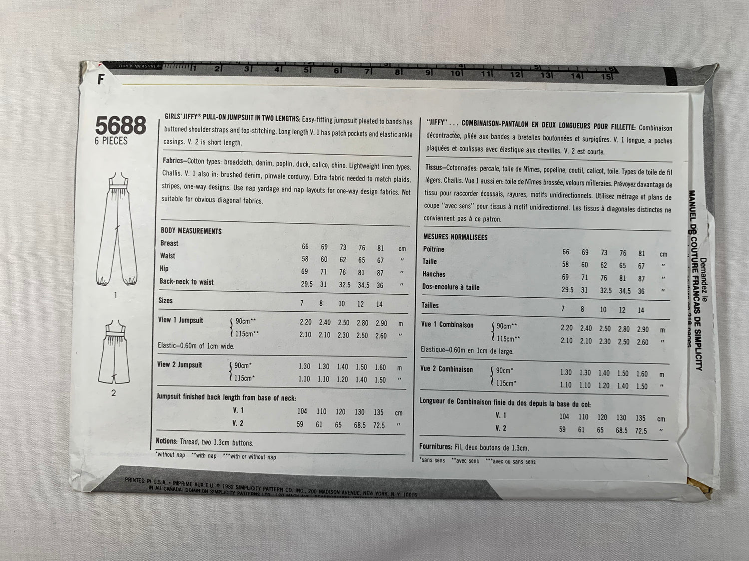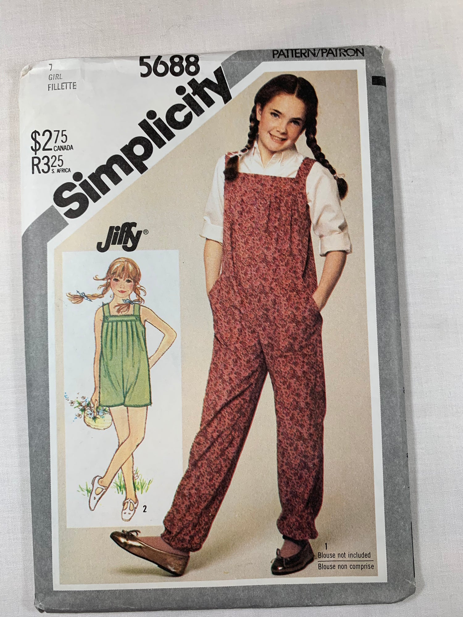 Simplicity Jiffy Sewing Pattern 5688 Girls' Jumpsuit, Pull-On, Two Lengths, 2 Variations, Easy-Fitting, Pockets, Size 7, Uncut, Vintage 1982