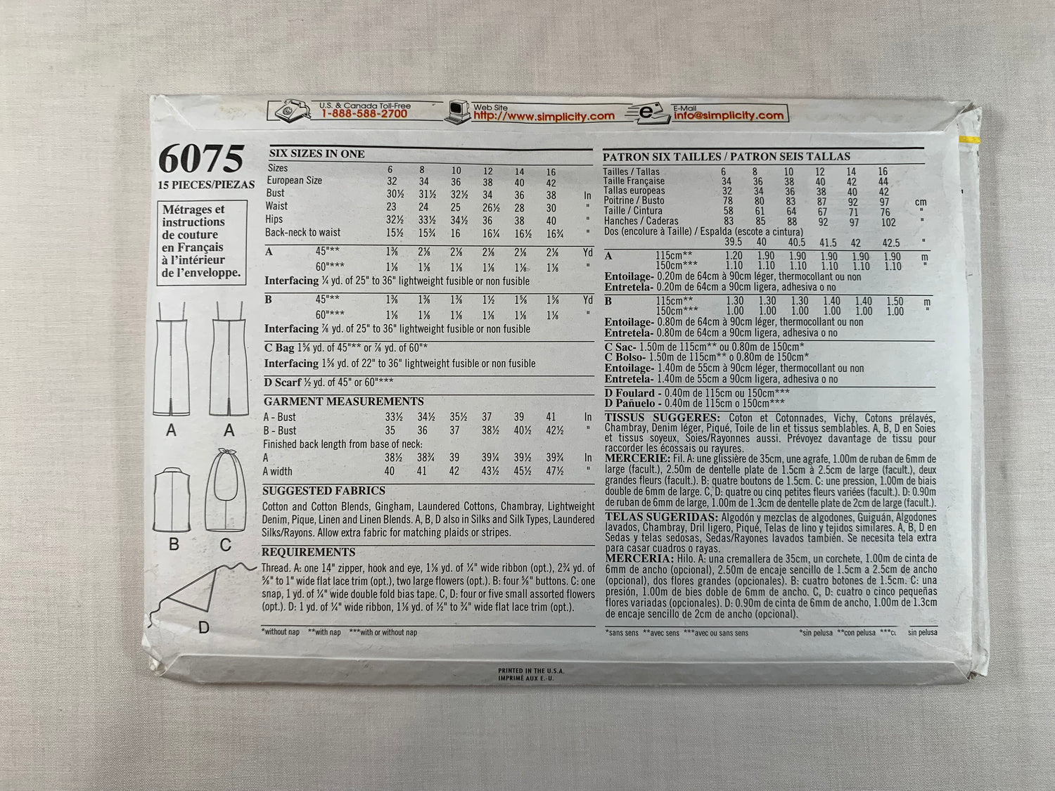 Fabrics: Cotton and Cotton blends, Gingham, Laundered Cottons, Chambray, Lightweight Denim, Pique, Linen and Linen Blends. A, B, D also in Silks and Silk Types, Laundered Sils/Rayons. Unsuitable for obvious diagonals. Allow Extra fabric to match plaids or stripes. Use Nap yardages/layouts for pile, shaded or one-way design fabrics. * with nap **w/o nap.