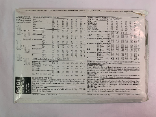 Fabrics: Cotton and Cotton Blends, Laundered cottons, Broadcloth, Lightweight Denim, Pique Poplin, Twill, Silks and Silk types. Challis, Linen and Linen Blends. Overskirt B,C,E in Lace, Voile, Organdy, Georgette, Double Georgette Allow extra fabric for matching plaids and stripes. Printed Fabrics. synthetic Leather or Suede Fabrics with pre finished Novelty Bordered edge. allow extra fabric for matching plaids or stripes.