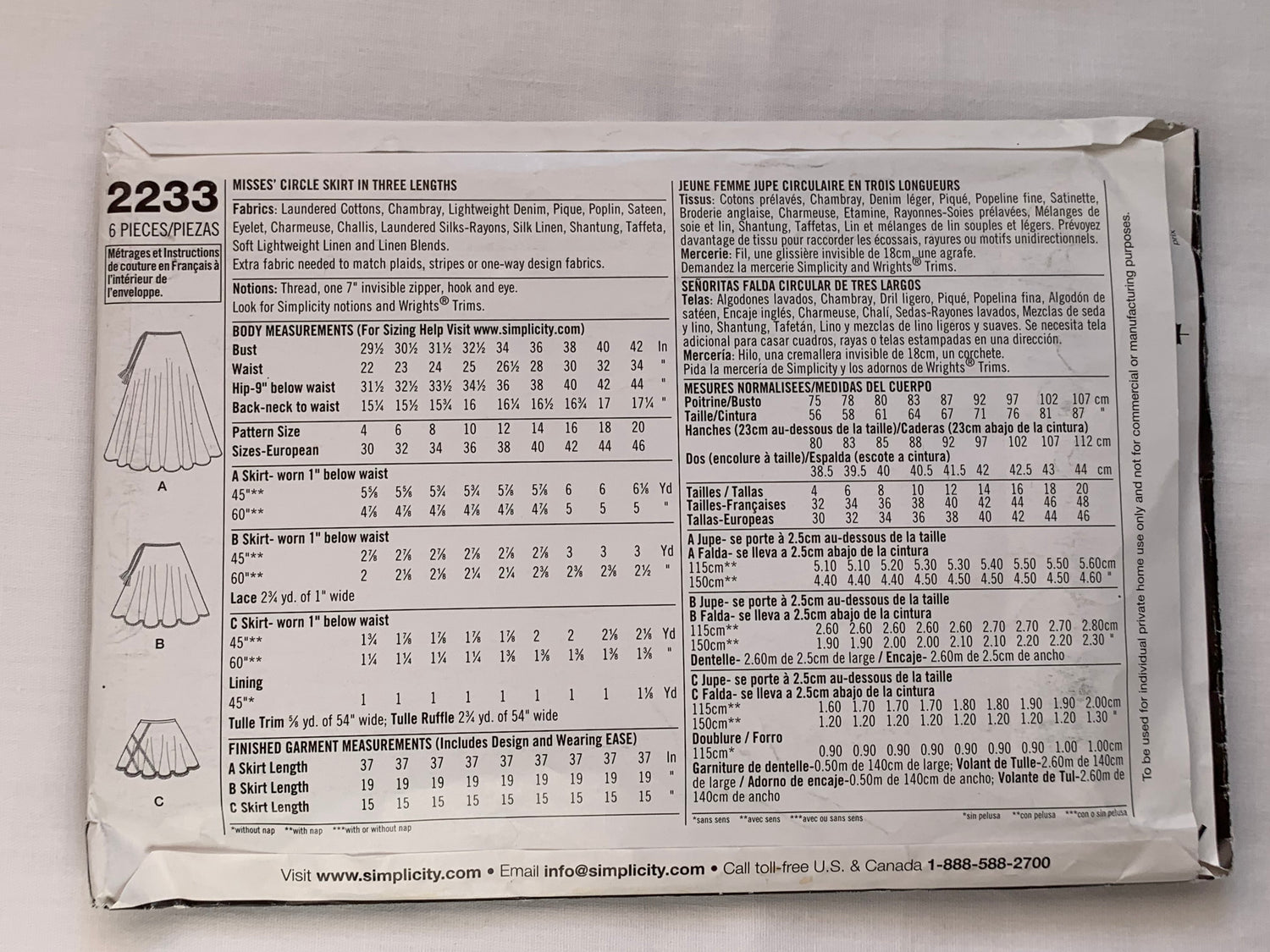 Simplicity Sewing Pattern 2233 Misses' Circle Skirts, Three Lengths, Side Zipper, Full Skirt, Size 4-12, Cut, Vintage 1990