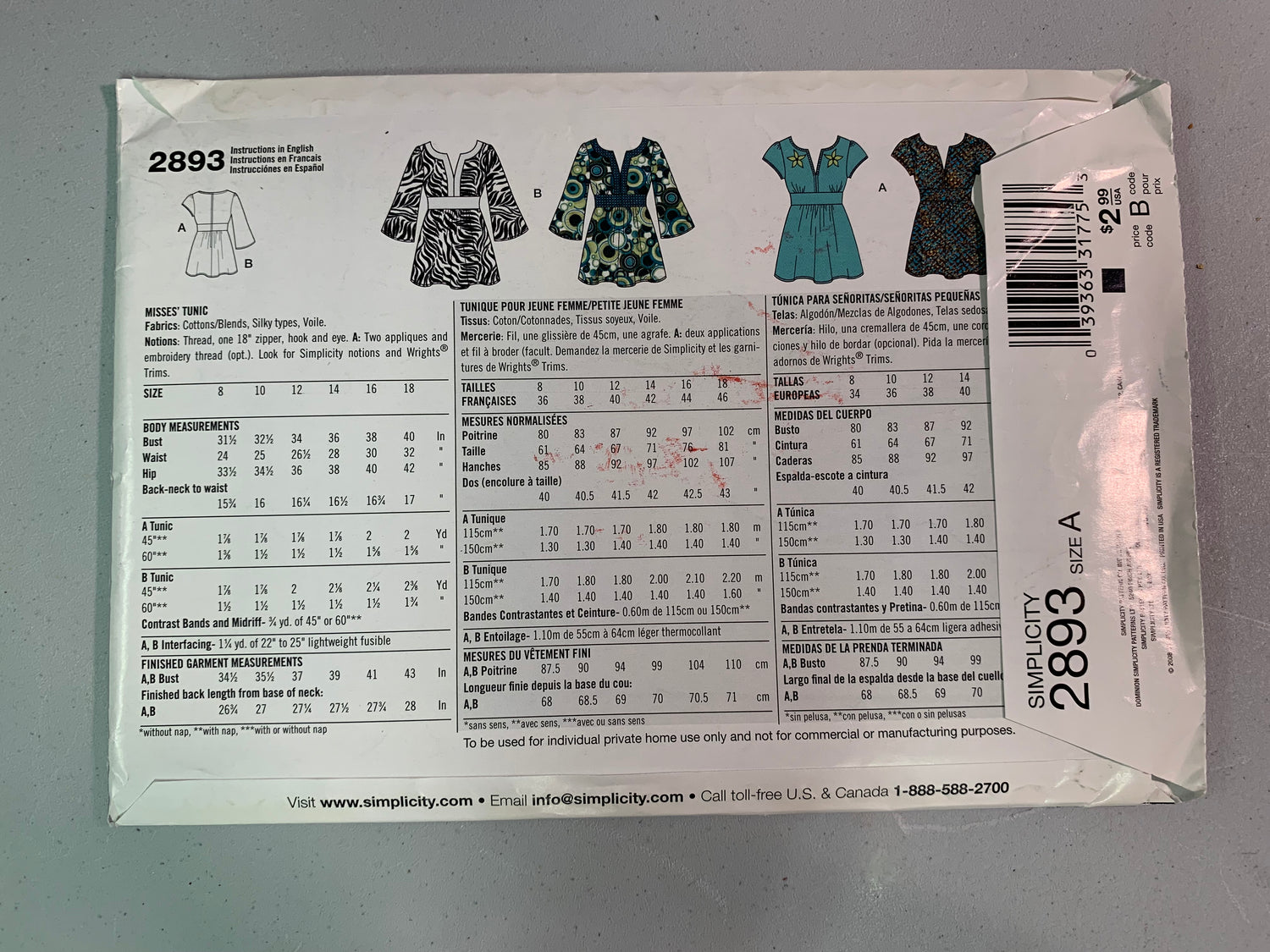 Simplicity Sewing Pattern 2893 Misses' Pullover Tunic, Long Short Sleeves, Gathered Waist, Size 8-18, Uncut, 2008