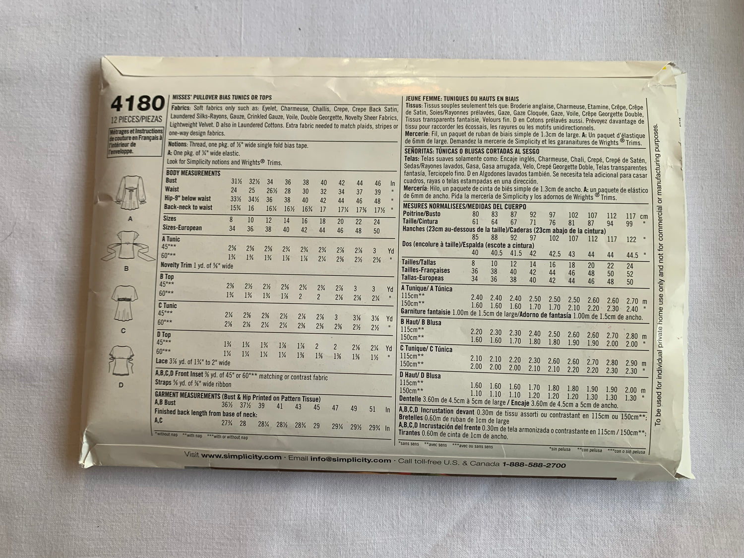 Simplicity Sewing Pattern 4180 Misses' Tunic, Top, Pullover, Long/Short Sleeves, Tie Back, Size 8-12, Cut, 2006