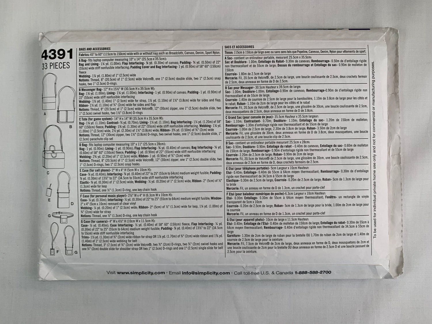 Simplicity Sewing Pattern 4391 Set of Bags, Accessories, Game System, Shouder Strap, Cd Holder/Case, Camera, Cell Phone, Messenger, Uncut, 2003
