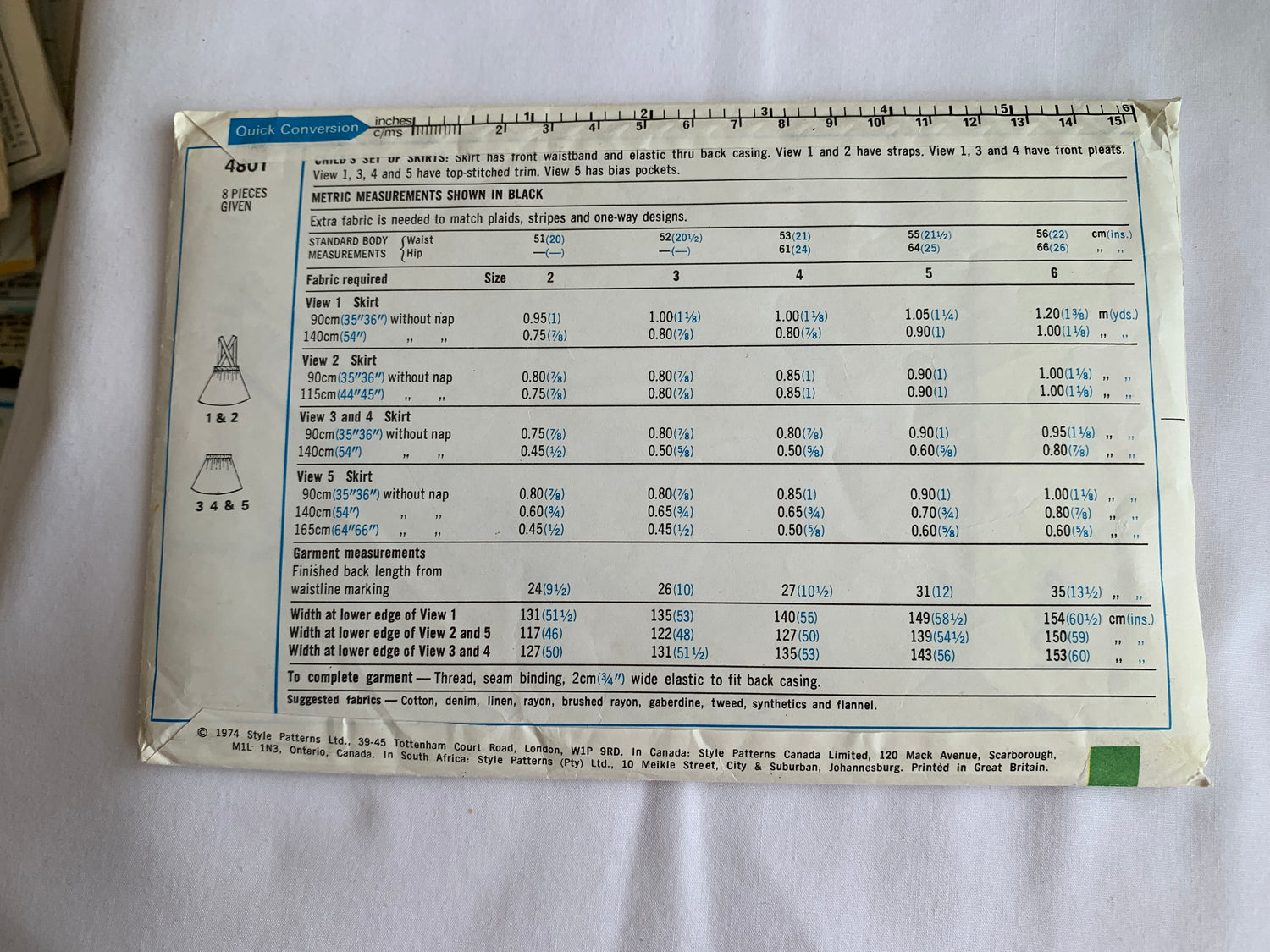 Style Sewing Pattern 4801 Girls' Skirt, Elastic Waist, Shoulder Straps, Size 5, Cut, Vintage 1974