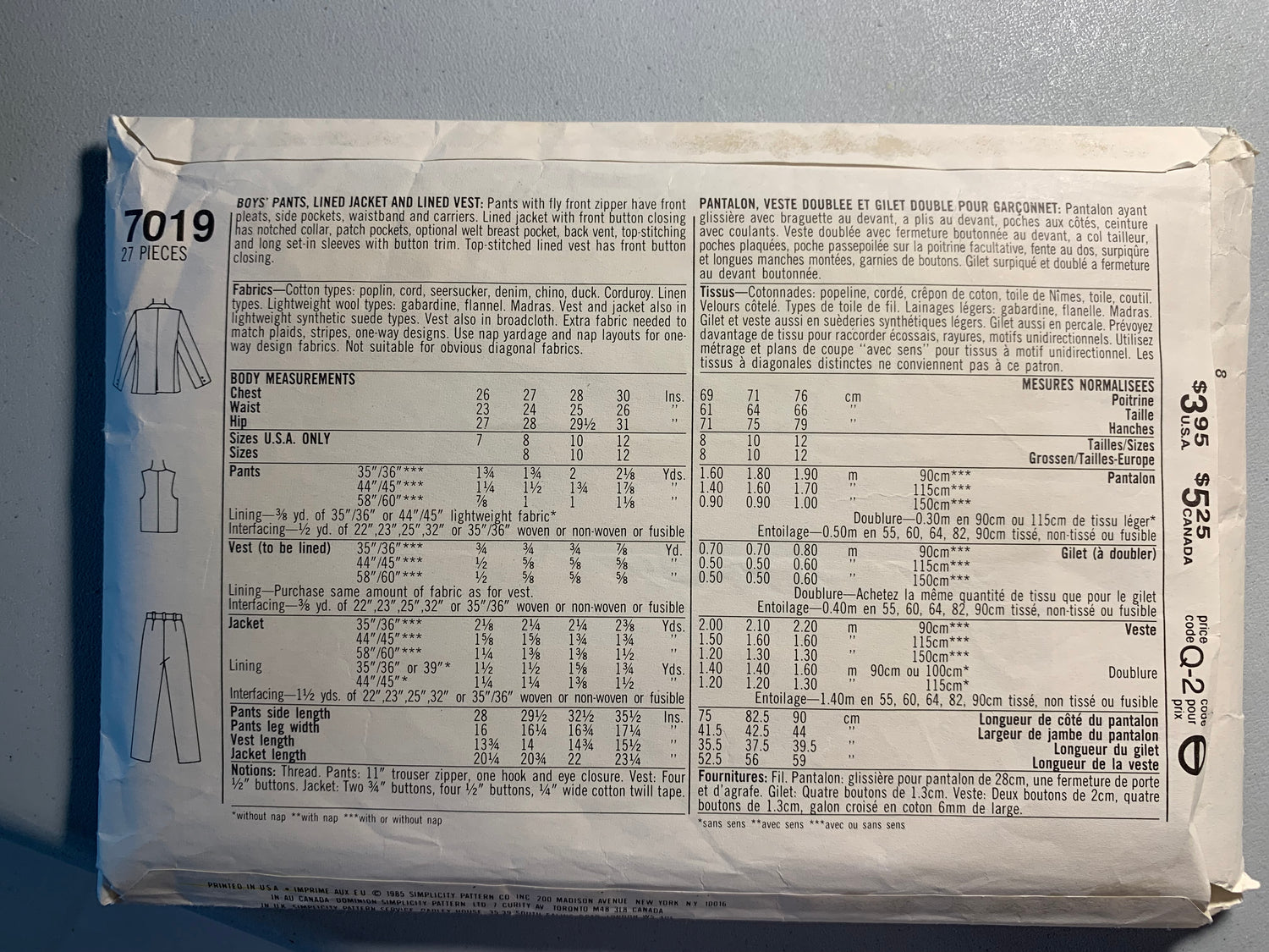 Simplicity Sewing Pattern 7019 Boys' Pants, Lined Jacket & Vest, Long Sleeves, Zipper Fly, Button Front, Pockets, Collar, Size 8, Cut, Vintage 1985