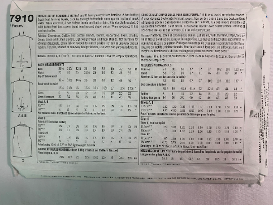 Simplicity Sewing Pattern 7910 Misses' Reversible Vests, Shawl Collar, Sleeveless, Button Front, Tie Back, Size 6-10, Uncut, Vintage 1995