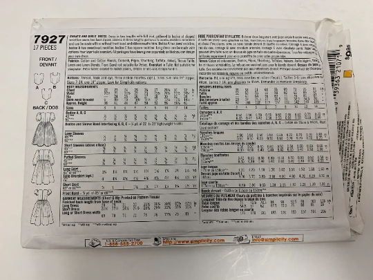 Simplicity Sewing Pattern 7927 Girls' Dress, Sleeves in Three Lengths, Two Lengths, Size 7-12, Uncut, Vintage 1997