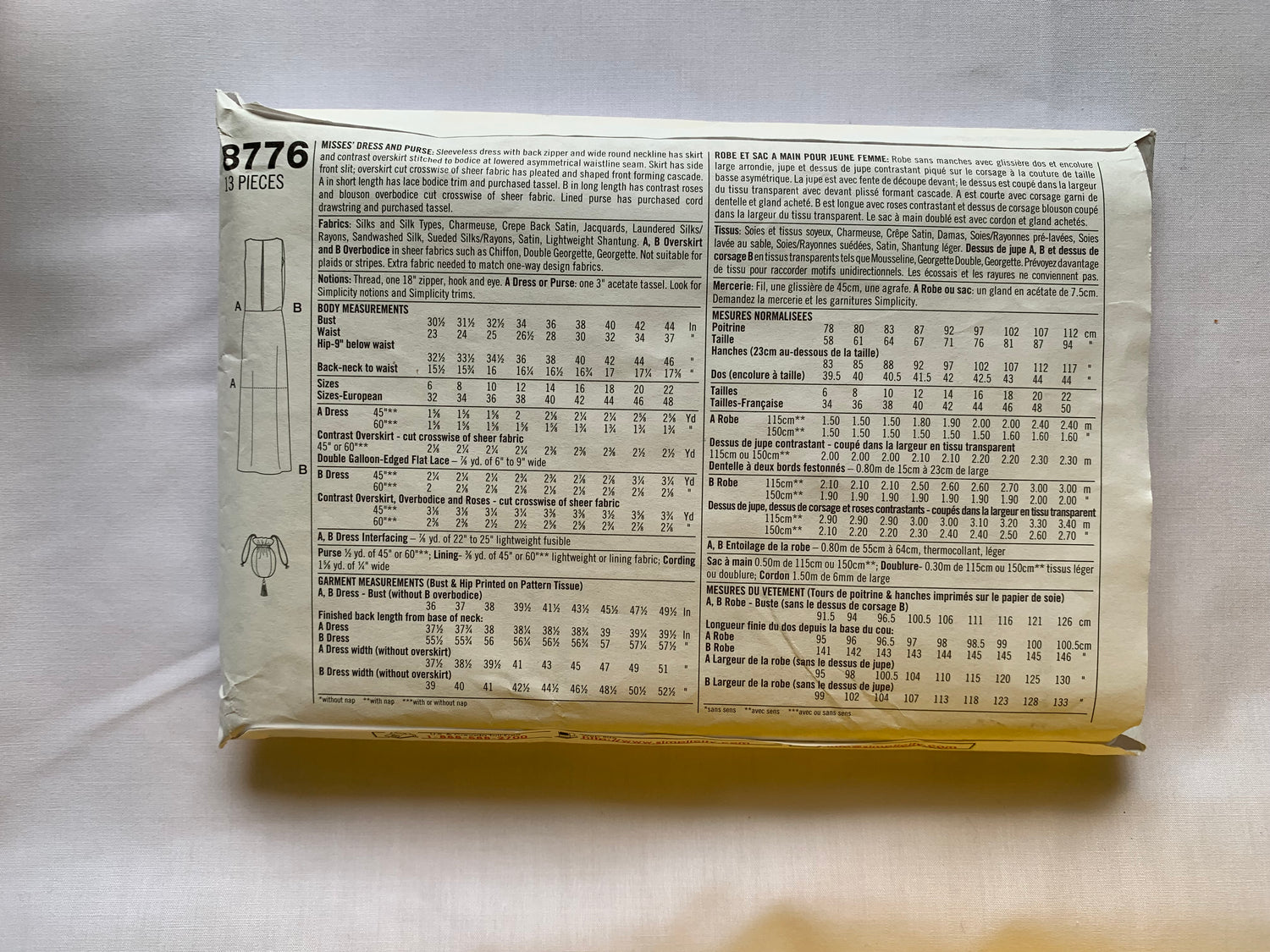 Simplicity Sewing Pattern 8776 Misses' Dress, Purse, Zipper Back, Overskirt, Drawstring, Sleeveless, Two Lengths, Size 12-14, Cut, Vintage 1999