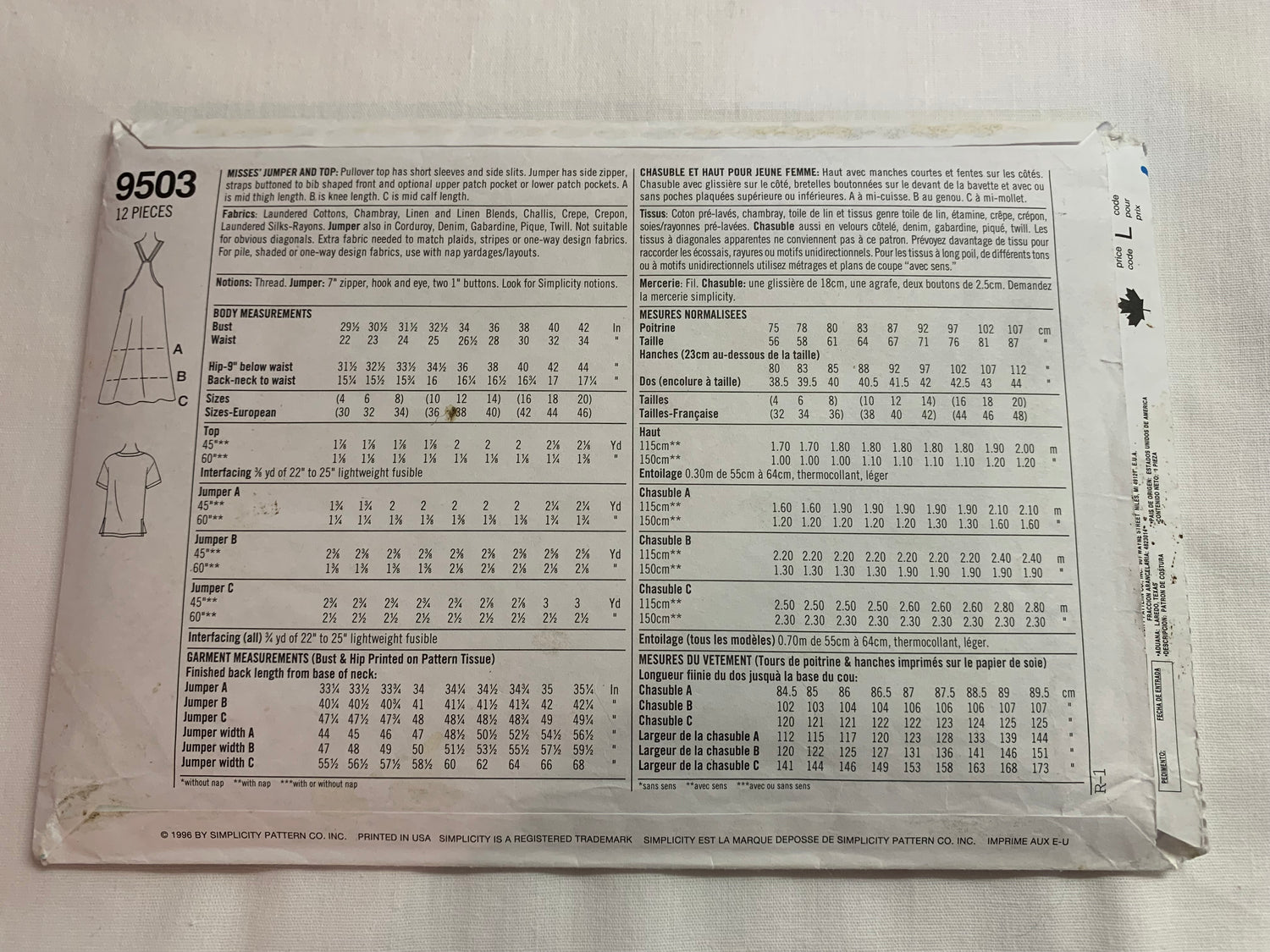 Simplicity Sewing Pattern 9503 Misses' Jumper, Pullover Top, Sleeveless, Three Lengths, Size 10-14, Uncut, Vintage 1996
